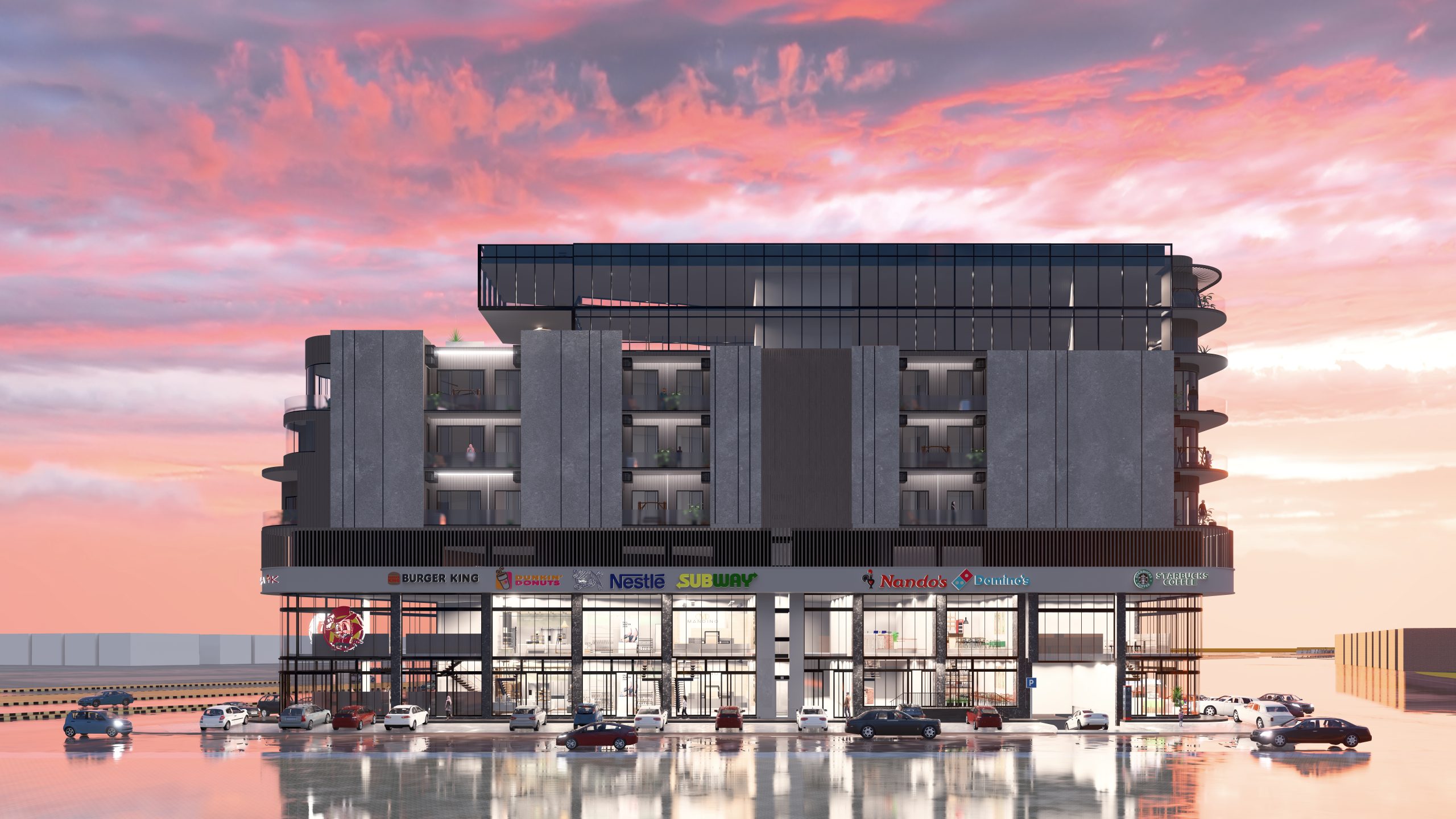 The ground floor is designed for commercial use, featuring multiple retail units, a spacious reception lobby, and a drive-thru facility. With ample parking and multiple entry points, the layout ensures seamless access for visitors and business owners. The inclusion of lifts and emergency exits enhances safety and convenience.